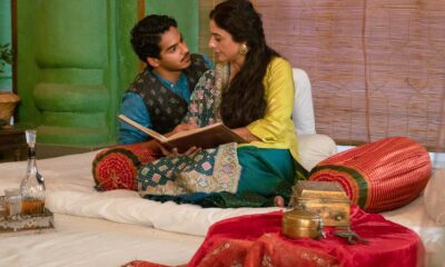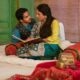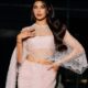 A pearl hair detail, glossy skin and a half-up hairstyle keep the styling in step with the sari’s finish