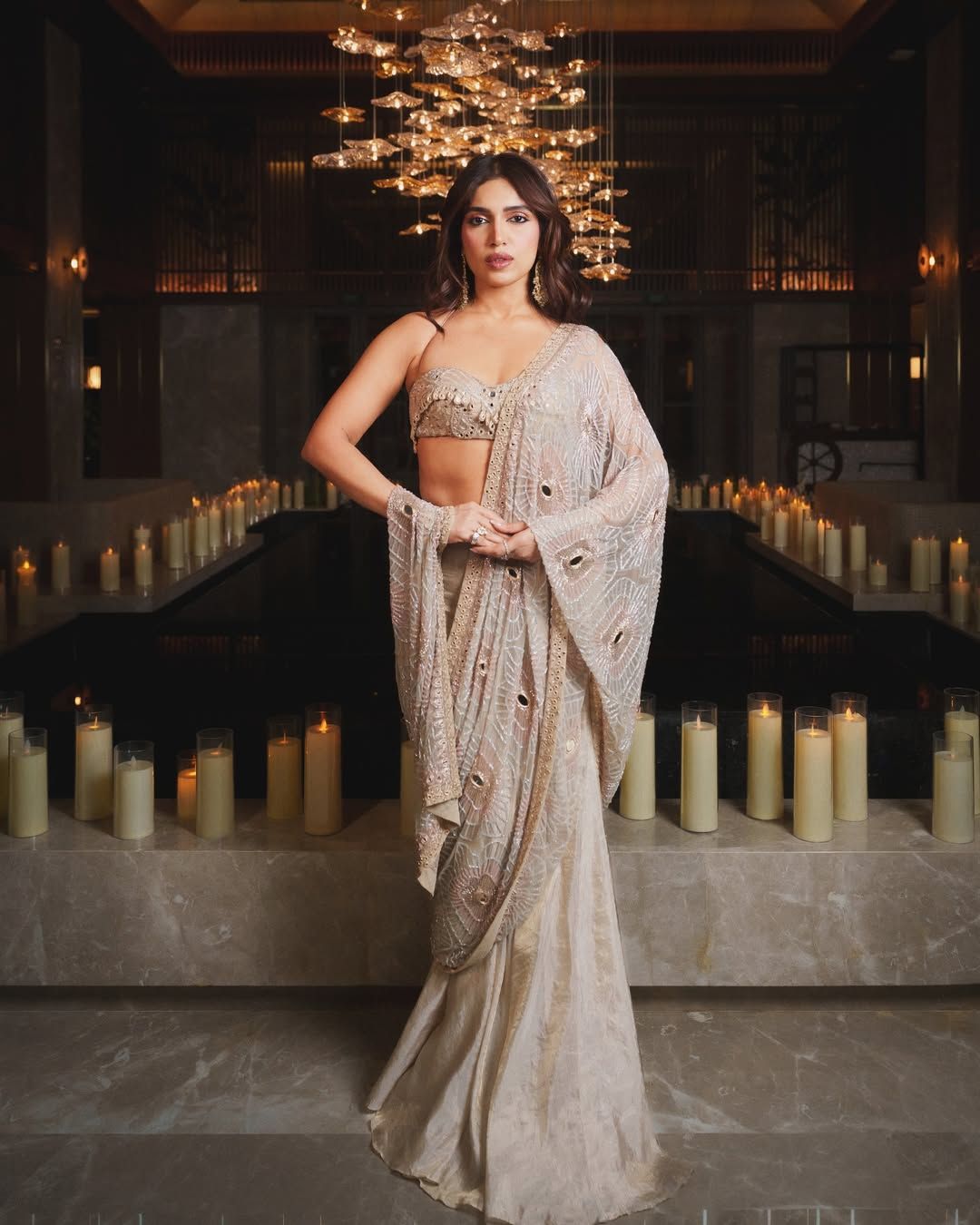 Bhumi Pednekkar shines in an Arpita Mehta tissue sari detailed with cutdana and mirrorwork