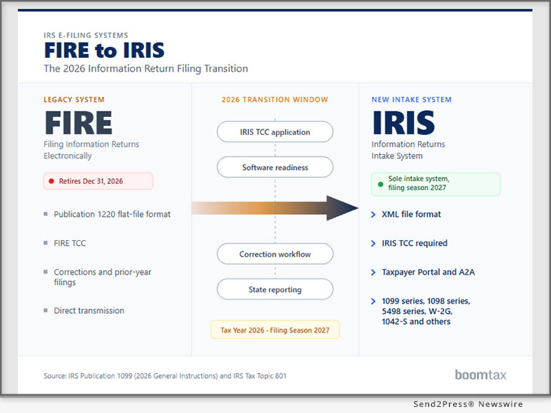 CORPUS CHRISTI, Texas, April 28, 2026 (SEND2PRESS NEWSWIRE) — BoomTax reports that, as the IRS targets retirement of the Filing Information Returns Electronically (FIRE) system at the end of 2026 and continues developing a process for corrections to original FIRE submissions, payroll, accounting, and enterprise filing teams face an unresolved 2027 transition question.
