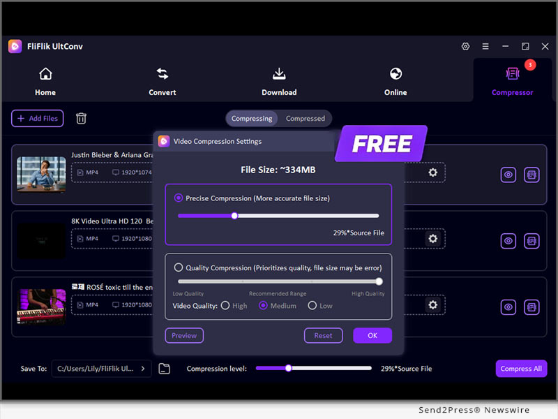 NEW YORK AND HONG KONG, April 28, 2026 (SEND2PRESS NEWSWIRE) — FliFlik, a rising innovator in high-efficiency multimedia solutions, officially announces the latest feature update to its flagship software, FliFlik UltConv Video Compressor. It provides users with a professional yet effortless way on how to compress a video for free, ensuring that large media files are ready for storage saving and fast sharing.