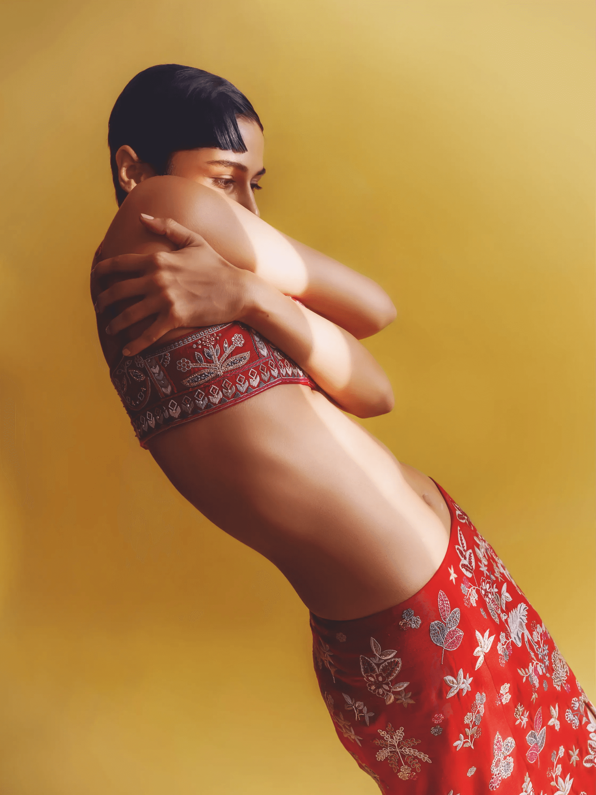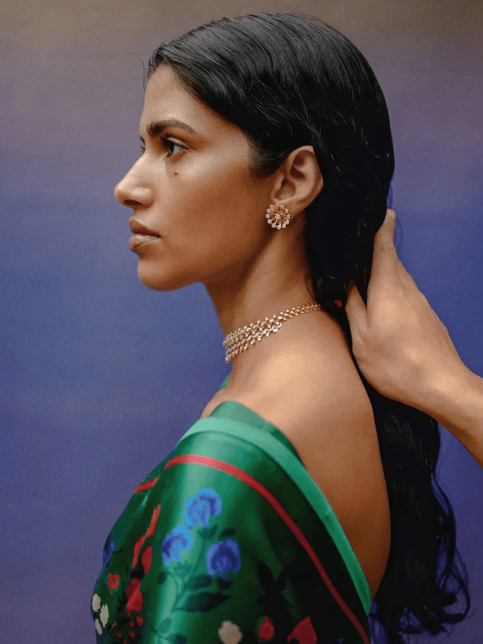 ​Beauty is kept pared back, balancing out the vibrant Jigyam Patel kurta set